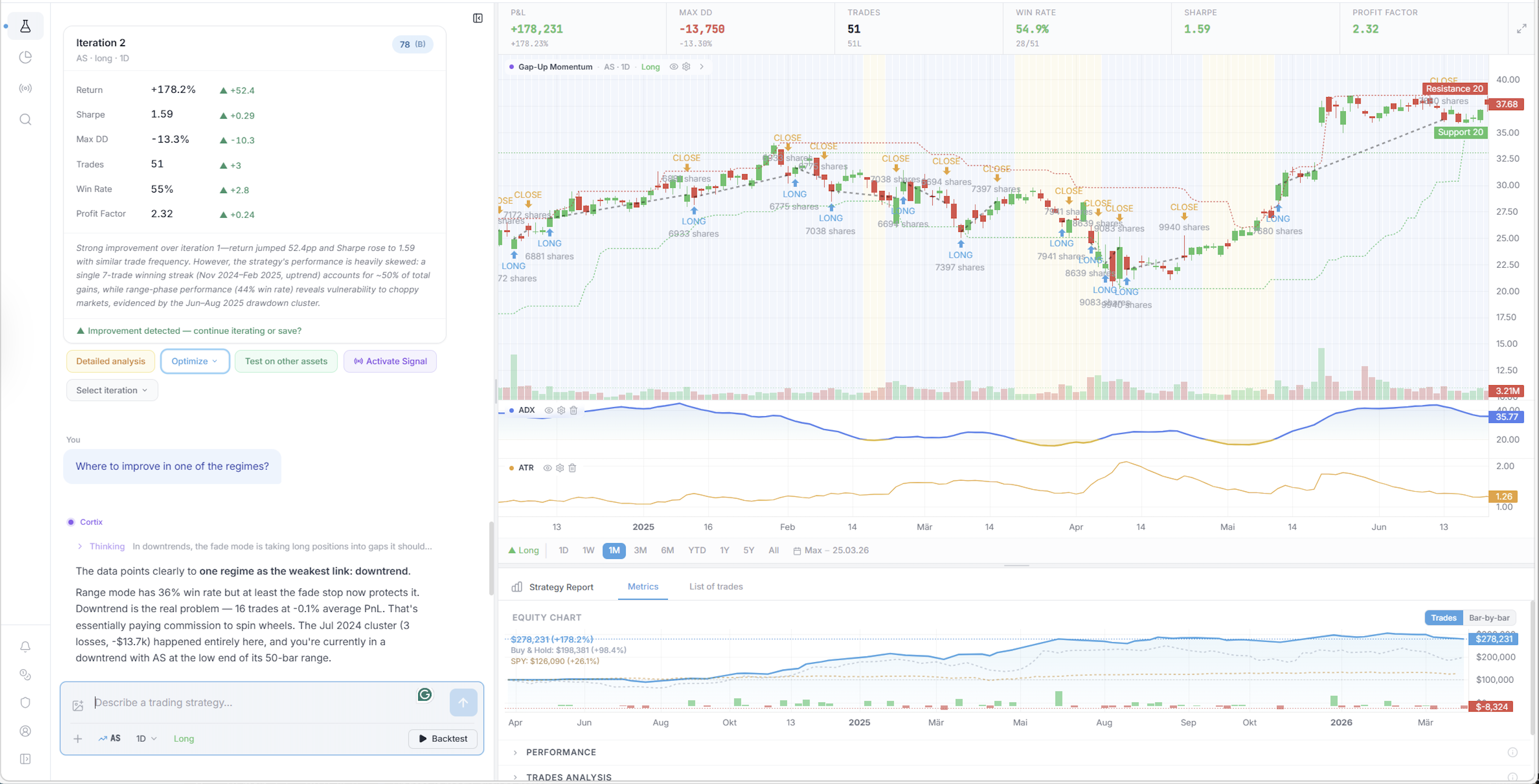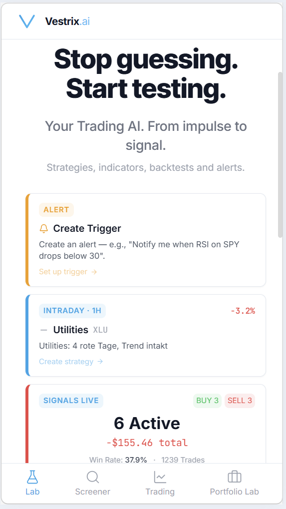 Sag was du handeln willst. Cortix baut die Strategie, testet sie und liefert dir Signale in Echtzeit.